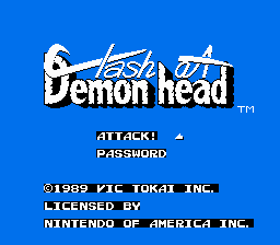Vic Tokai’s Clash At Demonhead is a rather unassuming game. You might think by the cheesy prog-rock style title and busy, airbrush- painted cover art, featuring a beefcake in metal armor and a radically dressed, short-skirted vixen, that Demonhead is in the vein of pulpy sci-fi schlock from the 1970s. Turn the NES on, though, and the game’s Japanese origins become apparent from the first cutscene with wide-eyed characters that wouldn’t look out of place on a cover of Shonen Jump.
