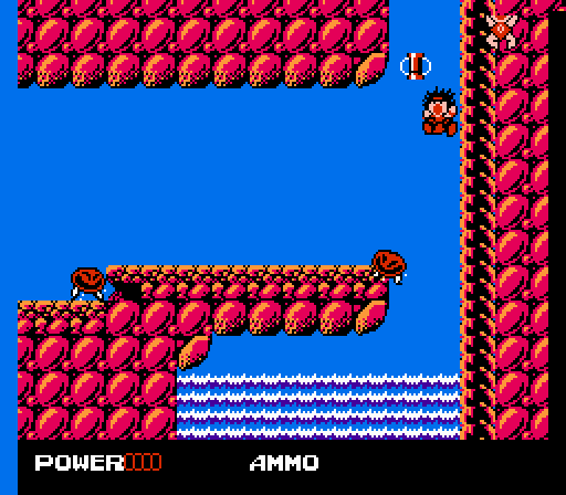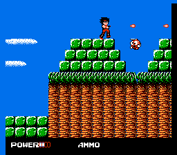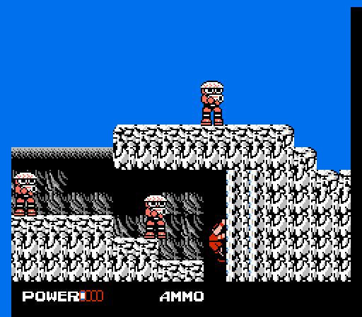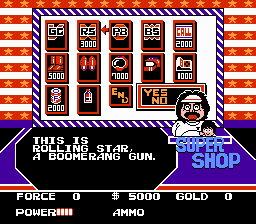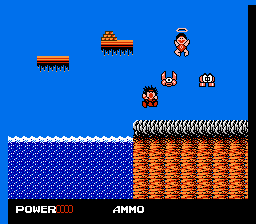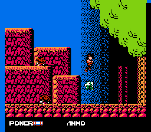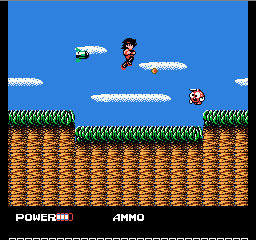 This first impression is fairly accurate of the early game; enemies are relentless and placed fairly haphazardly around the map. It’s not nearly as bad as many other incompetent NES platformers, and this is mitigated somewhat by the lack of knockback when damaged and fairly lengthy invincibility frames. Still, don’t expect a lot of breathing room. What’s worse is that Bang starts with just four bars of health, though a bar represents more health than just one hit (though the exact amount is also unclear). This is upgradable as the game goes on, but the lack of care put into enemy placement, plus the fairly inscrutable nature of the game’s open design, means that first time players may get frustrated and quit before seeing all that the game has to offer.