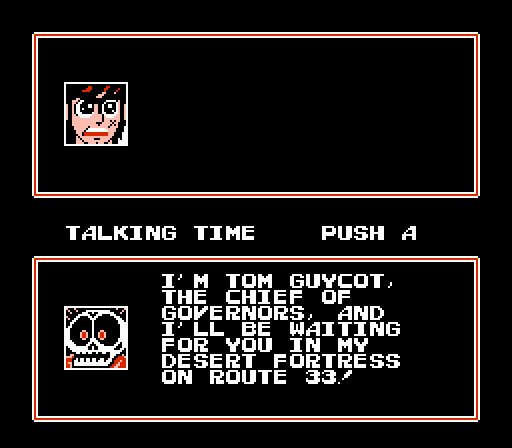 Perhaps the biggest reason why Clash at Demonhead is well remembered is just how dang weird it is. It’s fairly obvious early on that the game doesn’t take itself seriously, with names like “Professor Plum”, “Doomsday Bomb”, or that the main villain is a cape-wearing skeleton named Tom. The game has a fair number of gags, too. NPCs shout “No!” in a comic book style speech bubble when you shoot at them, and talking to them takes place on a separate black screen labeled “Talking Time”. A certain NPC has a tragic death scene, which is given full narrative weight, until you leave the screen and try talking to them again, where Bang will keep telling them to hang in there as their corpse goes through various stages of decay each time they come back.