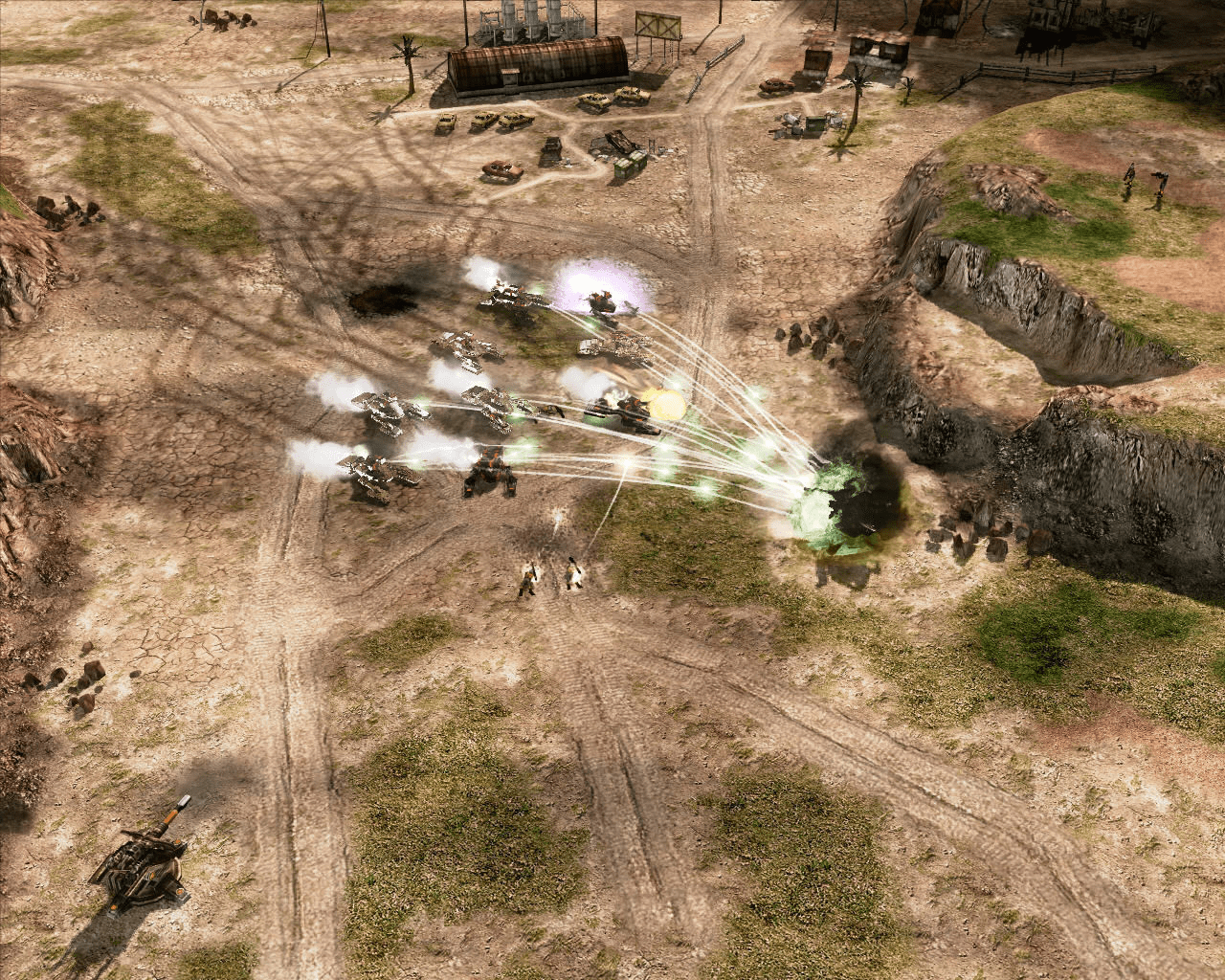 Much the same could be said for the gameplay itself in terms of how EALA tries to blend old and new. The very first sign of this that you’d see would be the return of insta-build structures in place of having worker units as well as the classic vertical interface instead of the more conventional RTS standard. Rather than being a direct transplant from Red Alert 2, however, that old Westwood staple has been modernized to include room for researching upgrades and multiple build queries among other things; thus, it’s possible like to train troops from multiple structures of the same type without having to designate a primary source. Once again, engineer units are needed to capture enemy buildings and neutral tech structures on the map; the latter in particular range from revenue-generating Tiberium spikes to hovels that allow you to recruit special minigun-equipped mutants that harken back to the Forgotten last seen in Tiberian Sun. In place of the “Generals system,” meanwhile are myriad faction-specific support powers, which are unlocked with certain buildings and can change the tide of battle if played just right – which can vary from veteran Zone Trooper deployments for GDI to Nod’s ability to temporarily jam radar to the Scrin being able to direct a meteor strike – though with the exception of superweapons (including the classic, nuke-equipped Temple of Nod), require resources to access as well as a cool-down time. These alongside various tweaks (such as making it possible to expand through deployable outpost units) complement the improvements carried over from Generals. All the while helping modernize the classic Command and Conquer style, with its tight balancing, wide selection of units and intense action. Even after all these years, nothing really beats the sight of Mammoth Tanks crushing both hapless soldiers and vehicles alike.