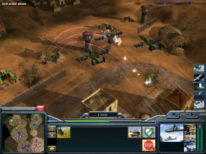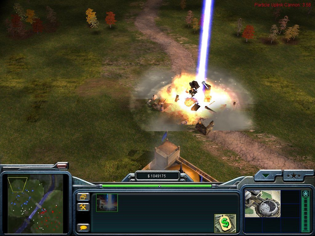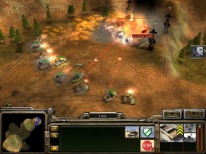 Looks though, can be deceiving. Building up on Red Alert 2’s diverse selections, the game not only has each faction have an almost entirely unique, if equivalent set of buildings and units, but also has each of them play to their respective specialties. For instance, the GLA’s emphasis on hit-and-run tactics and generally “dirty” warfare is reflected in the ability to set up decoy buildings and a scavenging mechanic that provides extra resources and even jury-rigged upgrades for certain units. Meanwhile, the Americans’ penchant for precision and technological superiority is shown through myriad, albeit expensive air units and vehicles with lasers capable of intercepting enemy missiles. Like in earlier installments, there’s no unit cap, with the number of combatants on the battlefield at any given time limited only by the resources (and PC power) on hand. There’s also enough in the way of balancing and flexibility that the game still provides room for experimentation and all sorts of RTS antics (including the classic tank rush) even while encouraging the chosen side’s strengths. All these, in addition to the environmental effects provided by SAGE, complement the infantry-crushing tank dynamic, garrisonable buildings (though unlike before, there are ways to clear out fortified positions without damaging them) and generally fast-paced action associated with C&C, while providing a fresh coat of paint.