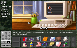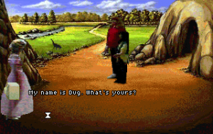 Indeed, it’s a bit meta to be playing a game called Companions of Xanth, which starts you in front of a computer, with a game package called… Companions of Xanth. In the game, you are actually Dug, a sixteen year old with a girlfriend and a general disinterest in stupid fantasy games. Although Dug is initially reluctant to play, he’s drawn into a competition to cross the land of Xanth and find a magical artifact. He’s not alone, though – another Mundane (the term for humans from the real world) named Kim is competing with him for the very same prize. The two are only told is part of some cryptic “Game”, but they don’t realize that the fate of Xanth lies in whomever can reach the end first.