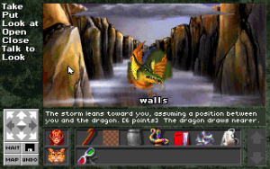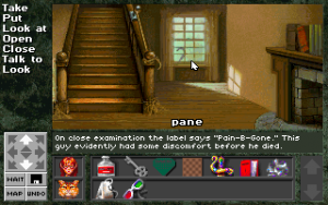 Although you can technically point on the screen to move, it’s much easier to use the compass on the side of the screen, which illustrates all available exits. Like the older Legend games, there’s also an automap option which replaces the main visual window, which is extremely helpful for a maze sequence that would otherwise be maddening. There’s also a Wait command to pass time, and an Undo command, handy for when a certain ill thought action leads to death. The 256 color VGA graphics are pleasant, if a bit bland. The MIDI music is much the same, and largely unremarkable. The CD-ROM version includes full speech for all of the dialogue, although all of the narration text is unvoiced.