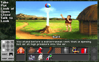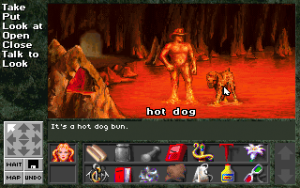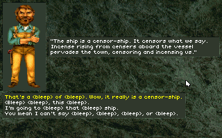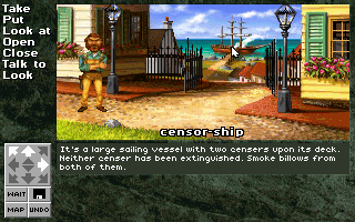 In many ways, Xanth is a typical fantasy universe – there are even four regions based on each of the classical elements. What sets it apart from dozens of similar universes is its light-hearted nature, and affinity for puns. Some of them are actually pretty funny – in the first major quest, you need to stop the censor-ship, a boat that makes it impossible to swear. (The CD-ROM version greatly enhances this section, if mostly because the parts where the text simply reads “(bleep)”, the voice actor fills in with dialogue like “g*d damn mother f**king c**k sucking *** licking”.) It also requires some lateral thinking, the kind that adventure games are more or less made of. You find some medicine called Pain-B-Gone, which in turn can be used to make a window pane disappear. Most of them are clever, some are painful, are puns are known to be. Take the part where you need to get rid of a dog made of lava. You need to ask Naga to tie her air into a bun, then garnish it with mustard. The dog runs away for its life – the text descriptor calls him a “hot dog”, you see. (Pause for groan and facepalm.)