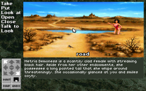 Once introduced to the game, you’re given the choice of four different companions: Nada Naga, the sexy serpentine princess; Jenny Elf, a young girl who’s accompanied by the clever Sammy Cat; Che Centaur, the magical horse creature; and the Demoness Metria, who appears to have stepped out of a 50s pinup magazine. This selection is a bit of nasty ruse, because there’s only one correct answer. All you need to do is look at the box artwork (or read the book) to see that you’re supposed to choose Nada, but all of the rest will get you killed almost immediately after transporting to Xanth. What a sham – it’s no fair to call it “Companions of Xanth” when there’s really only one. At any rate, a Companions job is to provide advice to the Mundane, so Naga is on hand to point you in the right direction, and occasionally solve certain puzzles, if you ask her nicely enough. Her presence allows novice adventurers to jump in and enjoy the game without it becoming too difficult.