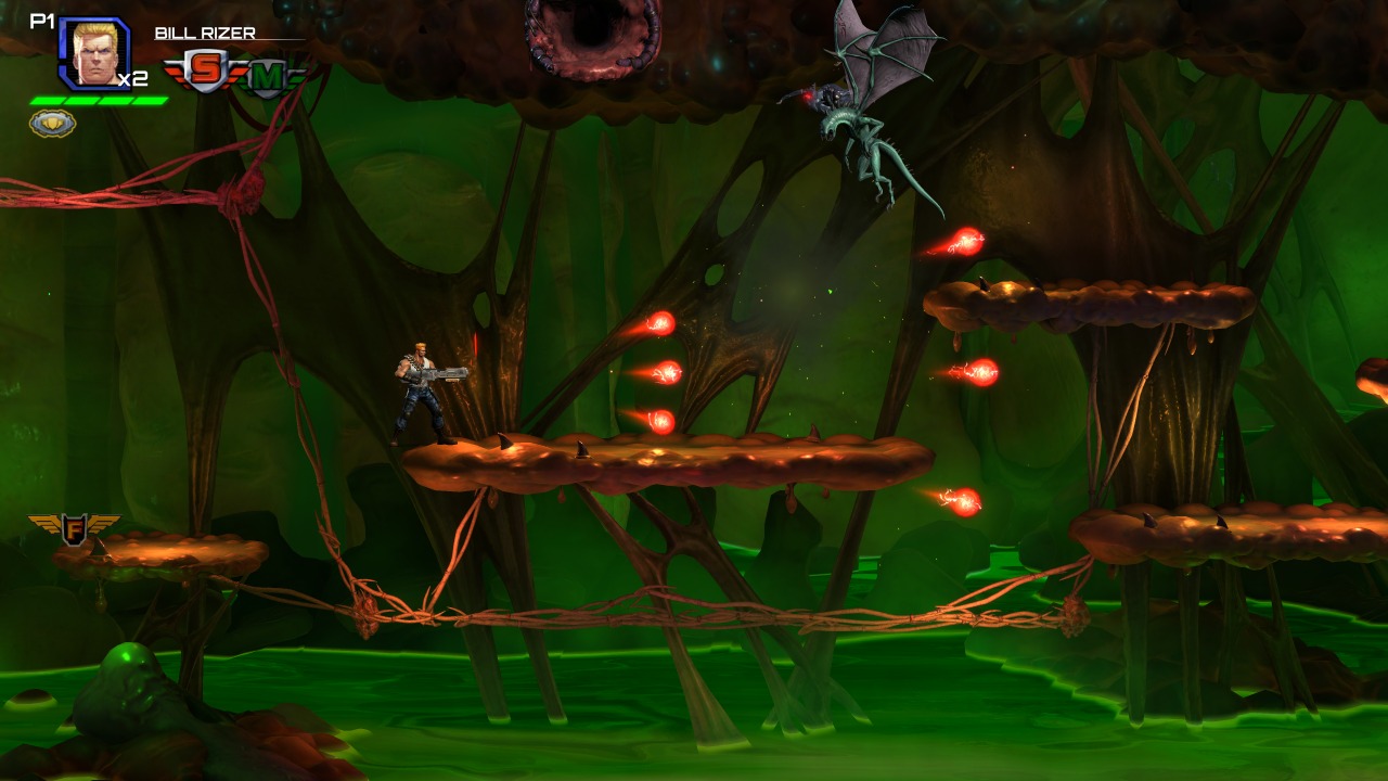 New to Operation Galuga is the 360 degree aim using the analog stick, which lets you more precisely shoot at enemies. The downside is that analog sticks feel spongy for 2D character movement, and you can still use traditional eight-way controls with the D-pad. But the enemy placements suggest that the game was designed with 360 aim in mind, so it’s highly recommended to make this compromise.