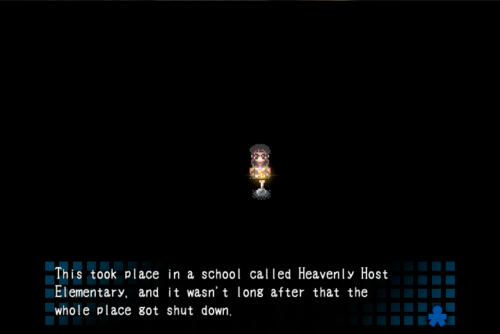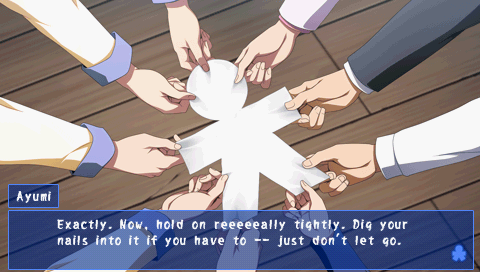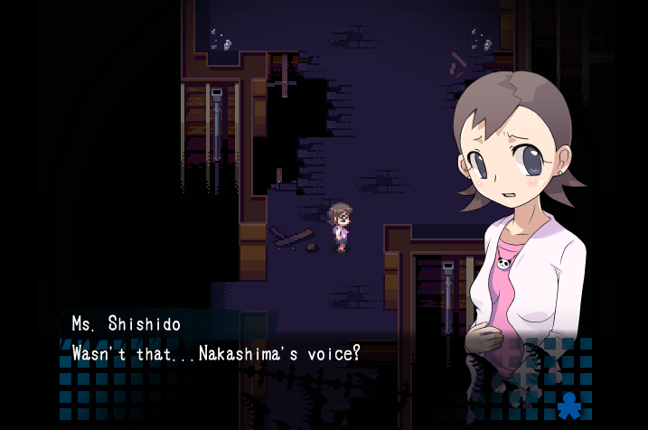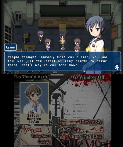 The introductory story is only slightly modified, but in the long run the player will see significant narrative changes. The story now begins with the extended cast of nine gathered to celebrate their last day at school with a beloved classmate. To mark the occasion, Ayumi produces a “magic charm” called “Sachiko Ever After”, which is supposed to unite the participants as friends for life. Unfortunately, after the party performs the charm, they are pulled into the otherworldly dimension of Heavenly Host Elementary.