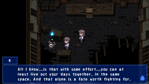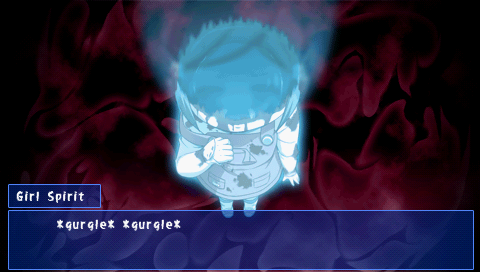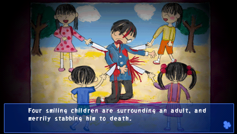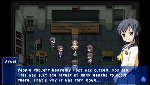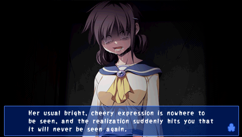 The PSP/iOS game features updated music, improved portrait art (which is more frequently used instead of the busts favoured by older versions), as well as new portraits for certain minor characters that lacked them. The game also improves the sprite of one of the antagonists, a headless child-ghost, by giving her a “glow” where her head should be, making her condition obvious at a glance. The PSP version added a whole seven Extra Chapters on top of the original three. Unfortunately, gameplay is sparse in these Extras: they are full Visual Novels, and quite short. The PSP/iOS version also saw the introduction of CGs, including CGs for most of the game’s Wrong Ends, although it lacks a CG Gallery.