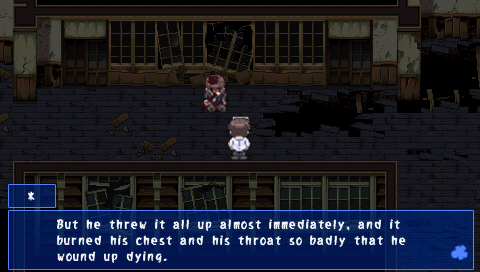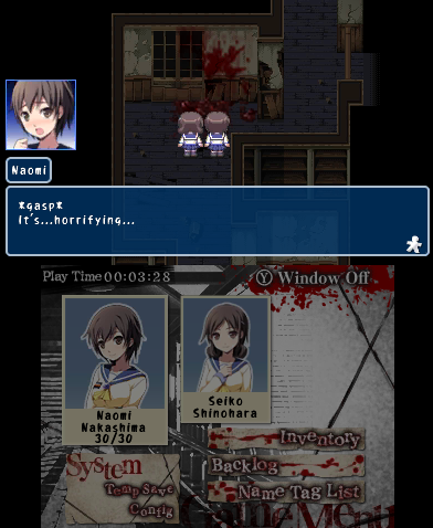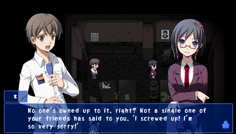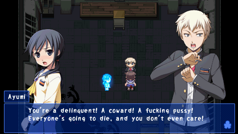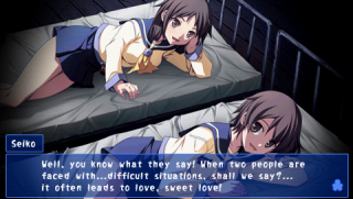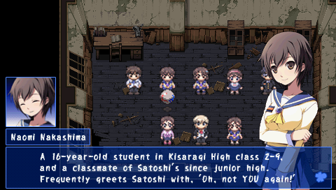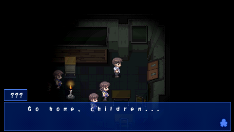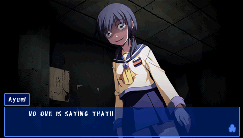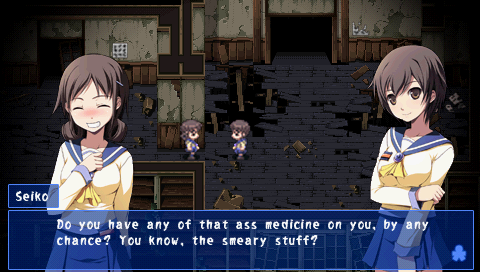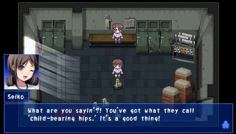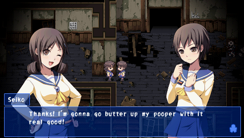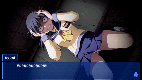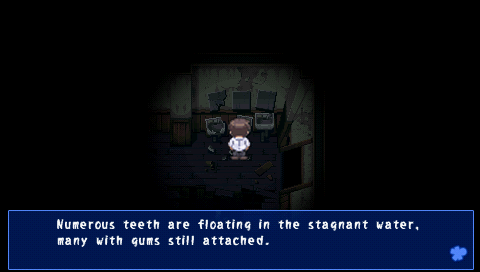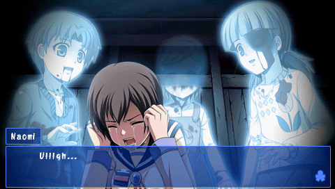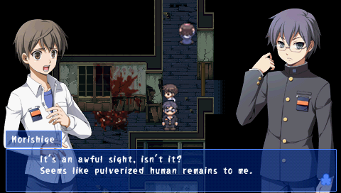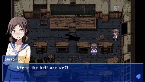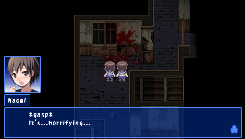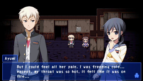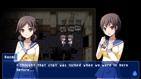 At this point, even though the game was still incomplete, publisher 5pb. Games bought up the rights to distribute the game on PSP, retitled Corpse Party: Blood Covered …Repeated Fear. The PSP version saw full release (all five episodes) in 2010, and was released in North America and Europe as by XSEED in 2011 as Corpse Party. This version only saw release via the Playstation Network. The PSP version formed the basis for the iOS port released in 2012 (JPN) and 2014 (NA/EU). While there are obvious differences in controls, the PSP and iOS versions are nearly identical. The iOS version does have additional bug fixes, including a fix for a missing nametag.