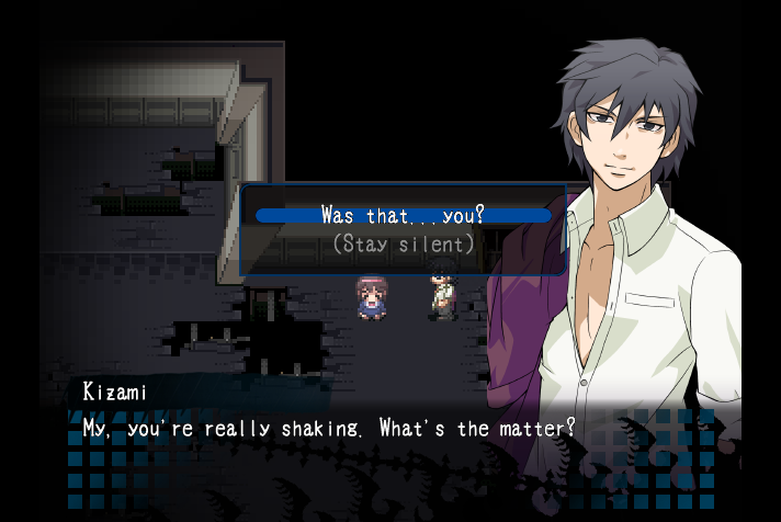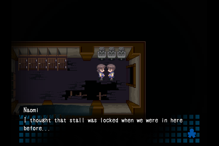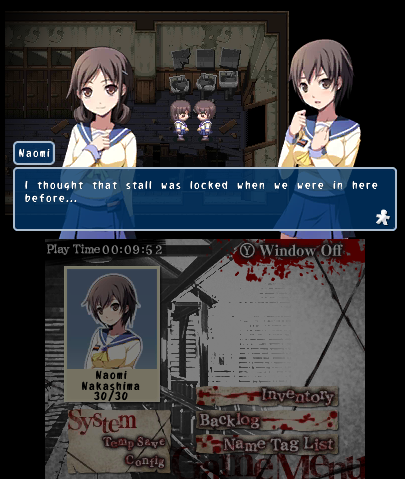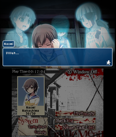 Gameplay is much the same as in the original CORPSE-PARTY, including the mostly-automatic puzzles, and more branching dialogue options. Nearly all the RPG elements from the original are now gone, save for the HP system. The HP system probably should have gone with them, as it’s only used three times in the entire game. Also present are multiple “chaser” enemies this time around, including three murderous ghost children and Sachiko’s favourite henchman, a hulking, hammer-wielding zombie. Unlike the anatomical model in the original CORPSE-PARTY, Blood Covered‘s chasers behave in the modern fashion for the genre: relatively close in speed to the player, and they can only detect the player within a radius. This makes them more of a dexterity challenge than a puzzle.