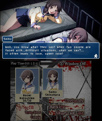 The 3DS version is mostly based on the PSP/iOS releases, complete with iOS bugfixes, but uses new, higher-resolution sprites, adds animation to some CGs (not always desirable, but not bad either), and also adds two of the VN features missing from the original: a text skip and a backlog. Unfortunately, the backlog is only available outside of dialogs, which partially defeats the point. The game even conveys your HP on the bottom screen for the whole three instances where that matters. This version also adds new character profiles, a CG gallery, and four new Extra Chapters, for a total of fourteen. These Extra Chapters are arguably the best in the lot, being quite sizable (in the neighbourhood of 20-25 minutes each for the first three) and having some measure of gameplay. Two of the four 3DS chapters were originally free DLC in Japan, but the international release includes all four by default.