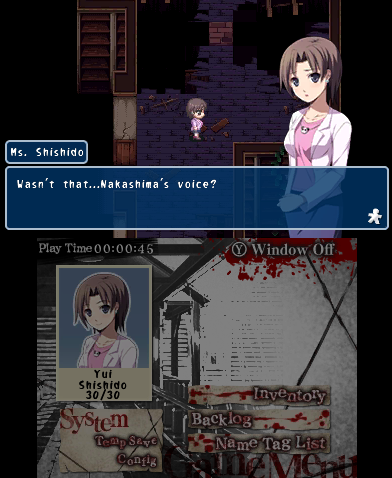 Unlike the original CORPSE-PARTY, the player won’t be able to get through Blood Covered without losing a few characters, even down the “True” path. In addition to these canon deaths, Blood Covered also features a number of “Wrong Ends” that occur chapter-to-chapter instead of waiting for the end of the story. Some Wrong Ends are tied to explicit mistakes, but others are almost gags. Generally speaking, Wrong Ends occur the moment you screw up, making it easy to identify your mistake. Unfortunately, there are Wrong End that take time to strike, and they can easily confuse the player. In one case, the belated Wrong End is a “Dead Man Walking” situation where the game is waiting for you to inadvertently select from two deaths, but most of these “long” Wrong Ends take place in Chapter 5, where they carry on until the end of the story in reference to the 1996 game. One such ending, Chapter 5 Wrong End 2, deserves special contempt. This is the “everything goes wrong” ending, and it cuts out every part of the chapter that doesn’t fit its drastic changes. This includes nearly all gameplay, leaving you with what’s essentially an hour-long cutscene that’s full of plot holes!
