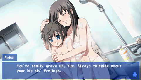 One of the biggest features in the PSP release was full voice acting using a new cast. The 5pb. Games voice actors are much bigger names than the cast hired for the original PC release, and several cast members are career singers with connections to 5pb. Games’ sister company, 5pb. Records. Naturally, some of these singers were employed to provide the songs for the game’s opening and closing credits. Voice actresses Asami Imai (Ayumi) has songs in most of series’ games and spinoffs, sometimes teaming up with Eri Kiamura (Yuka) as part of their pre-existing joint act, ARTERY VEIN.