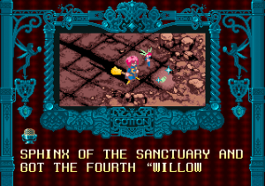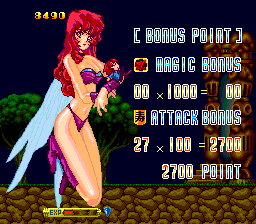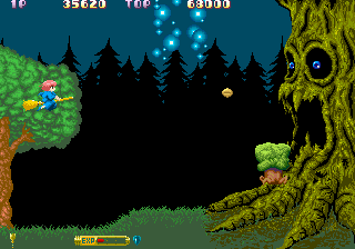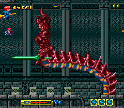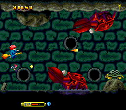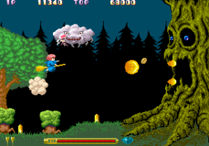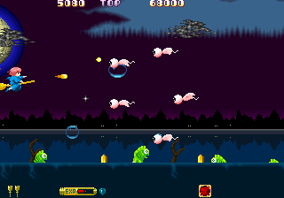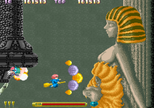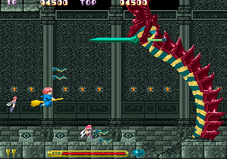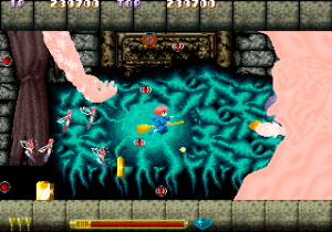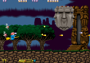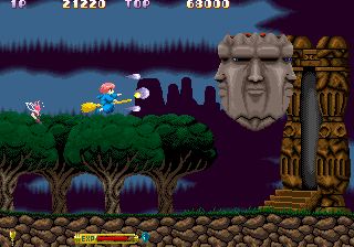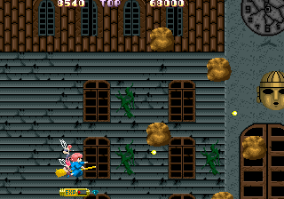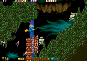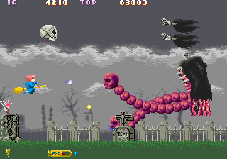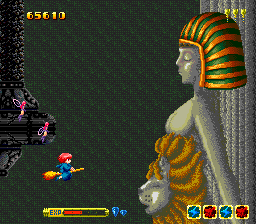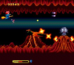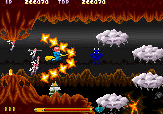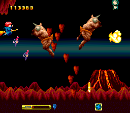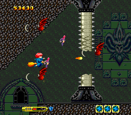 Despite the seemingly cutesy theme, Cotton doesn’t rely on pastel graphics and goofy boss characters like Parodius – this game is downright dark, as Cotton flies through dank caves, flaming volcanoes, and gothic castles. There are some weird boss characters too, including a cloaked skeleton, a Cleopatra statue with a lion head in its stomach, and a plant creature with one ugly face.