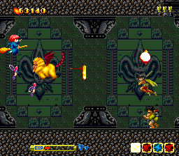 The two types of magic have both offensive and defensive properties. By charging up the main power shot, you can cast a super strong attack – a flaming dragon for red and a lightning shot for blue. These are extra useful because you’re also temporarily invulnerable when casting them. If you charge both the attack and the bomb buttons, you’ll cast the spell as a defense attack – blue will give you a bubble barrier, while red will surround you with flames. It’s a strategic trade-off, because while the red flame dragon is relatively weak, the flame shield is super powerful; comparatively, the lightning spell is the strongest in the game, while the bubble barrier isn’t all that useful. You can obtain up to four spells at once.