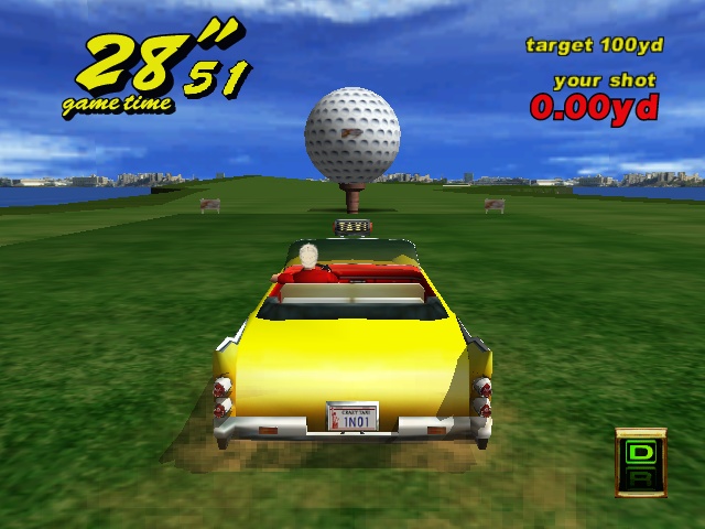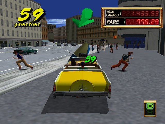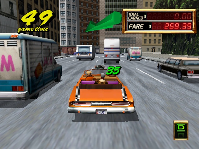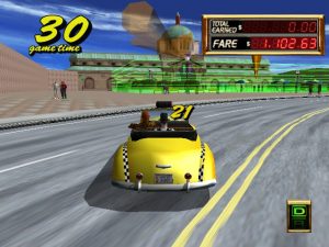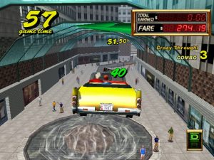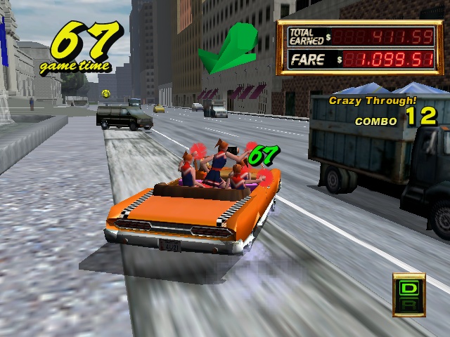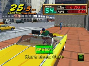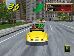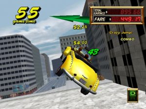 The other big advancement for the Crazy Taxi formula is the Crazy Hop maneuver, or the ability to propel your cab into the air. This move alone changes the entire dynamic of the game. Instead of veering in and out of traffic to reach your goal, you can simply hop over it. The inclusion of this move adds even more techniques to your arsenal, such as the Drift Hop (jumping up to a ledge and drifting to drive the opposite direction). It’s also perfect that the development team would based the level design around jumping. Shortcuts are well placed, usually just a hop away and you’ve cut through a huge portion of the play area to get huge amounts of money. Crazy Taxi 2 based on the building laden city of NYC being called “Small Apple” and the much smaller area “Around Apple”. It’s a nice change of pace after playing the first one to death with it’s hill filled areas of San Francisco although some would argue that these new areas have a bit of a confusing layout compared to the original game.