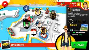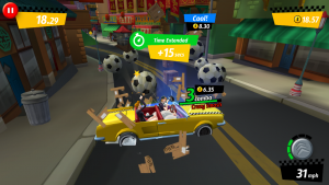 Don’t be fooled by the game’s extensive use of usual freemium elements like recharge times, daily missions, bonus-granting character customization (or in this case, taxi pimping) and timed events, though, because under this dreaded hood lies raw, classic Crazy Taxi action with all the tricks and, well, craziness that made the older games so memorable, except with simplified controls and limited movement. City Ru$h is a first in the series as due to its mission-based nature there is an actual objective besides making money, and that is completing the multiple tasks given by the original games’ cabbies (who now own their own taxi companies), that often revolve around a short, silly story and the one-time customers involved. These objectives are extremely hard to accomplish from the get-go, though, so it’s advised to upgrade your cab before you tackle them, but to do so you need money and to get money you must play other missions (or you could, y’know, <i>purchase it</i>), so yes, in the end it really it all bogs down to making crrrrrrazy money, just like old times.