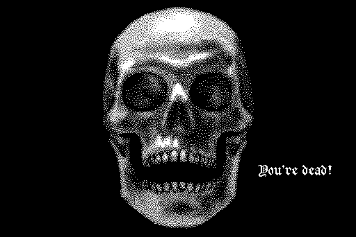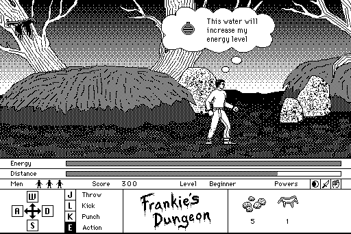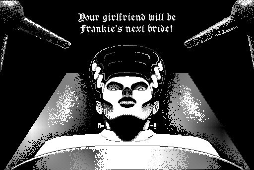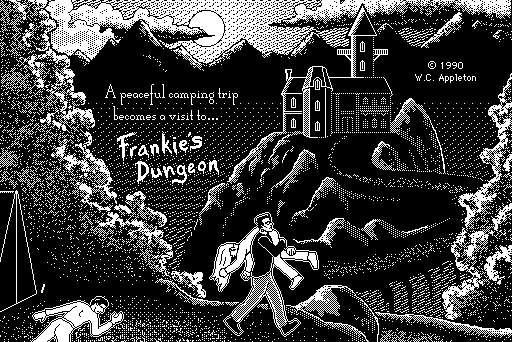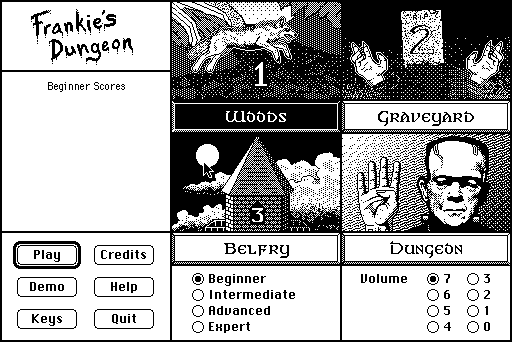 Interestingly, there’s actually two releases of the game, with Creepy Castle being an updated version put forth by an actual publisher. The original version of the game, known as Frankie’s Dungeon, can be found online with a little searching. The two versions have almost entirely different graphics and sounds, with Castle having a more dithered, photorealistic look. Frankie’s Dungeon, however, has the voice talent of Dick Noel, who voiced the main character in Dark Castle. The two games are almost identical in terms of gameplay, however, except that Creepy Castle offers the save feature. Because of this alone, it’s probably the better version to try.