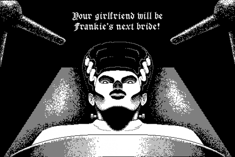 What the game lacks in gameplay, however, it certainly tries to make up with presentation. The black and white graphics on early Mac computers suit the gothic horror stylings well, and the sprites are well animated. There’s other nice touches to point out as well, like the Crypt Keeper-esque ghoul who shows up to give game hints and deliver dumb puns between stages. The sound is more than adequate as well, with plenty of digitized sound effects. This does make the main character come off as a bit of a doof, however, like the way he’ll randomly exclaim “Power!” upon beating a boss or getting an upgrade. There’s no music to be heard, except for a short theme on the title screen and a few stings between levels.