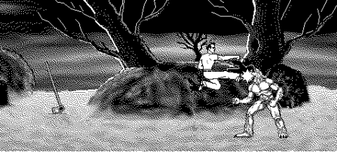What the game lacks in gameplay, however, it certainly tries to make up with presentation. The black and white graphics on early Mac computers suit the gothic horror stylings well, and the sprites are well animated. There’s other nice touches to point out as well, like the Crypt Keeper-esque ghoul who shows up to give game hints and deliver dumb puns between stages. The sound is more than adequate as well, with plenty of digitized sound effects. This does make the main character come off as a bit of a doof, however, like the way he’ll randomly exclaim “Power!” upon beating a boss or getting an upgrade. There’s no music to be heard, except for a short theme on the title screen and a few stings between levels.