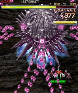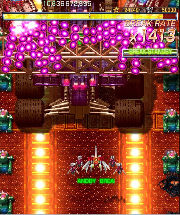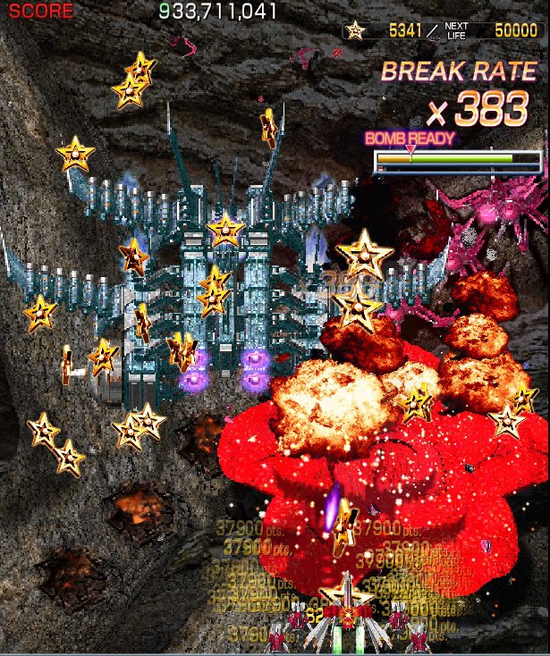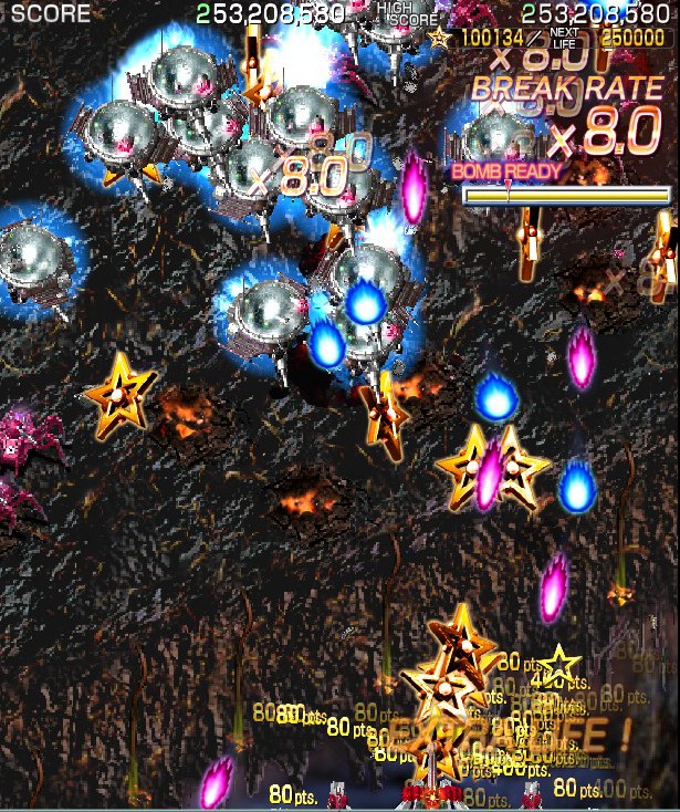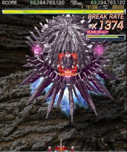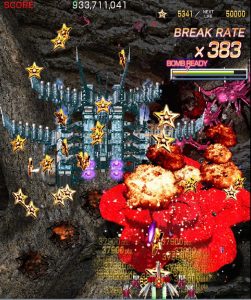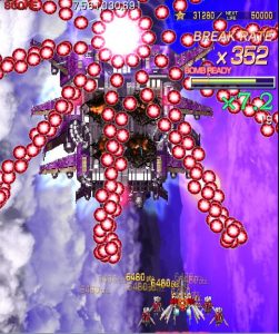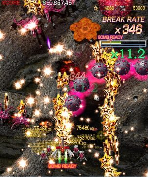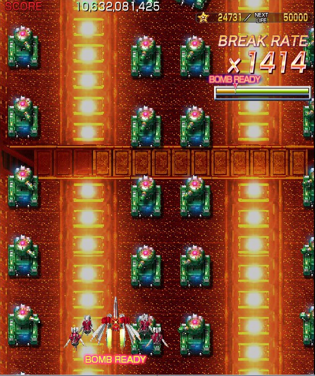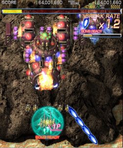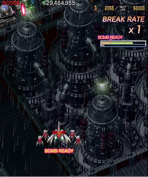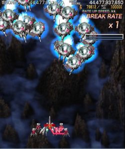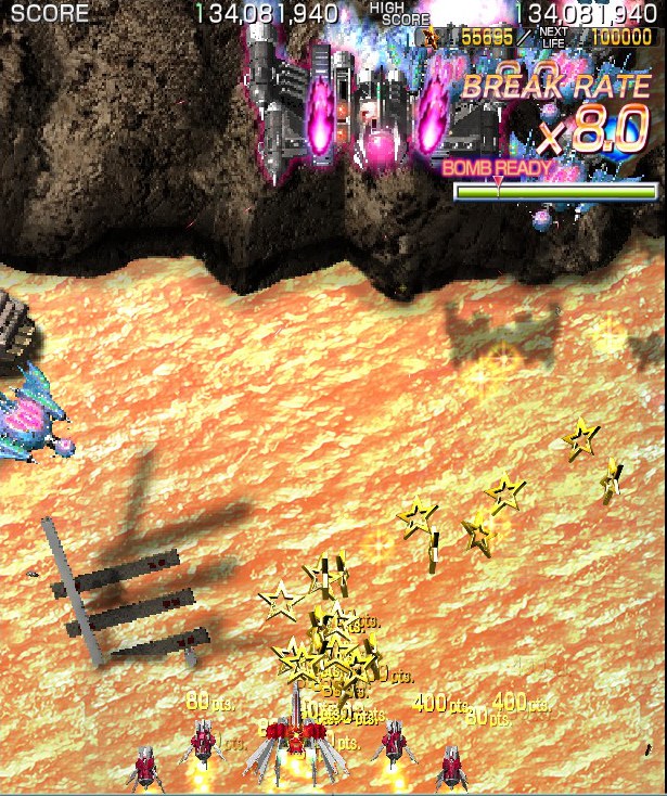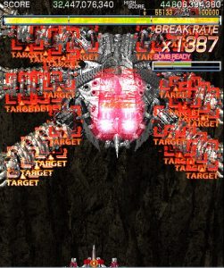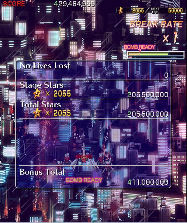 Crimzon Clover‘s gameplay is based around a lock-on shot which works similarly to the one featured in RayStorm and RayCrisis (bonus multipliers and all), and the BREAK system, the latter of which acts both as the game’s main scoring mechanic and as a bomb stock. By damaging and destroying enemies, canceling their on-screen bullets, and collecting the star items they drop, you fill up your BREAK gauge, which can be used to either trigger the BREAK and DOUBLE BREAK modes – which double and quadruple both your firepower and your scoring potential, respectively – or to set off a screen-clearing bomb, which unlike the ones in most danmaku shoot-em-ups, can also convert on-screen shots into star items.
