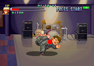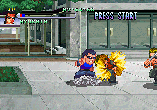 Speaking of patience, therein lies the game’s greatest fault: its pacing. In the beginning the stages go by very quickly, but there are too many of them before you get to a boss and the loading screen that pops up between each breaks the flow of the action. The wait isn’t very long, but it’s a bit jarring that it’s there in the first place, considering the 2D graphics don’t exactly push the Saturn hardware to its limit. As you advance the levels get longer and the game starts to drag quite a bit. Stronger hits leave you unconscious, requiring that you mash buttons to get your senses back. This happens a lot later on and quickly becomes annoying. It would have helped to have the option to save, because it’s rather long for a single session. Playing with a friend alleviates most of these problems, as you face the same number of enemies, resulting in a faster and less frustrating experience. For a single player, there is still a bit of fun to be had, especially in the early levels, and it remains an interesting curiosity for fans of Crows or Technos beat-em-ups.