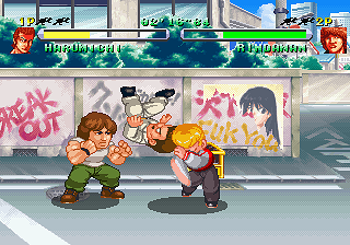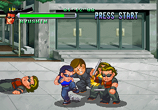 Punches and kicks are assigned to seperate buttons, however regular attacks don’t chain into combos as is normally the case but rather push the enemy back. This is probably the game’s greatest flaw, as it makes fighting more trouble than it should be. As such, the main characteristic that distinguishes the four characters is the different ways in which they can knock enemies to the ground. It takes three regular attacks to do so, but some moves hit more than once or hard enough to do it instantly. For example, Bouya’s jump kick and running attack hit twice if they land properly, so following either with a punch or kick will do the trick. Meanwhile, the other three’s running attacks will knock opponents off their feet instantly, but their jumping attacks only count for one hit. As you begin to face bosses and stronger opponents you will find that throws are often the only reliable option.