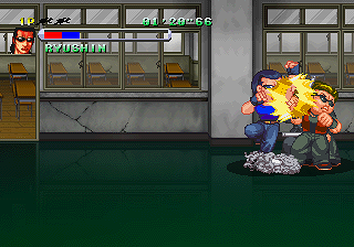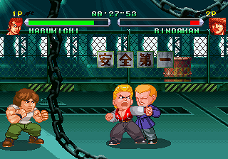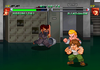 While there is no story in-game aside from a text intro and a brief recorded speech before the credits roll, the levels and bosses are based on five story arcs from the manga, starting with the confrontation with the Front of the Armament bosozoku gang and ending with the struggle for the top among the new generation of Suzuran freshmen. There are two characters available initially, Bouya and his early rival Rindaman, a quiet loner of legendary strength. As you advance in the game you will unlock two more characters, whom you must first defeat: Ryuushin, the Front of Armament’s vice-president when you first encounter him, and Tatsuya Bitoh, the middle brother of the Housen Academy banchou dynasty. They do not join right after you beat them, but at later points in the story corresponding to their becoming allies in the manga. Crows fans will be disappointed that many of the most likeable among the series’ massive cast of character are nowhere to be found – no Bulldog, Ebizuka trio, Maruken and Kakuken… On the other hand, the final battle pits you against none other than Zetton on the school’s rooftop, a scene from the manga which coincidentally evokes River City Ransom‘s ending as well. Some minor antagonists appear exclusively in two-player mode, as sub-bosses immediately preceding the main boss fights.