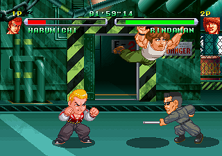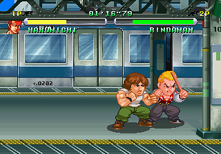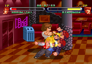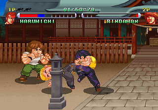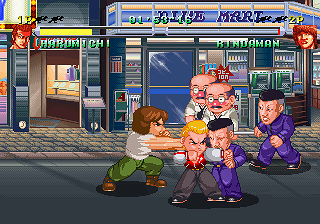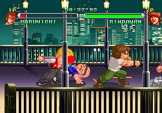 Published by obscure developer Athena Co. (Dezaemon), it appears at first glance heavily inspired by Technos’ own hot-blooded Kunio/Nekketsu beat-’em-ups, going for River City Ransom‘s fighting style and super-deformed looks in particular. As it turns out, it’s no coincidence; a look at the credits reveals that quite a few former Technos employees worked on it, including executive producer Teruo Ishikawa, who was the project leader for Voltage Fighter Gowcaizer, the composers, and about half the graphics team. Most notably, the person in charge of the visuals was Kouji Ogata, who’d worked as a character designer on most of the original Double Dragon series, Combatribes, Super Dodge Ball (both of them) and many others. Considering that none of them are credited on subsequent Athena releases and that Gowcaizer was Technos’ final release before their bankruptcy in 1996, this suggests the possibility that Crows may have started out as a Technos project.