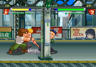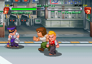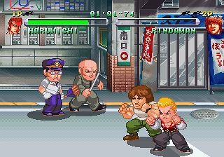 Unlike River City Ransom, however, its structure is linear, dividing the game into numerous short levels where you fight various types of hoodlums, cops and drunken salary men. Some areas also feature young couples sitting on benches or cleaning crews – they will mind their business as long as they’re left alone, but hitting them will attract more cops or stir them into fighting back. Though it appears to be shown from a side-view, the stages are actually skewed at an angle, so heading North or South has the characters walking diagonally, which takes some getting used to.