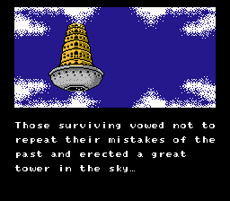Both versions are set in a post apocalyptic future where magic has emerged to replace technology. In the NES version, the tower was an ancient weapon used to judge humanity to see whether it progressed beyond the wars that destroyed it in ages past. Mesia and the hero were scientists who had helped design the tower before being put in stasis, and were charged to make the final decision as to whether or not it should be used, based on how humanity has grown since the last disaster. Naturally the Empire wants it for its own purposes of world domination, making it a race to get control of the tower.