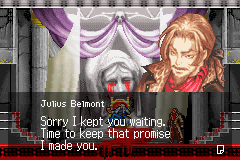 Julius: You fought well. When we fled the castle, I felt the power from Vampire Killer fading away. I don't know what that means. But I won't have to do anytrhing for the time being. Farewell. May we meet again.