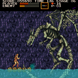 A larger version of the usual skeleton dragons in the Castlevania games, these are wrapped around the wheels that open the gate to the castle. They move around quickly and shoot fireballs, but will leave behind quite the bounty when you kill them.