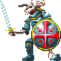 warriors. Brandishing a short sword and leather shield, the Skull Knight and