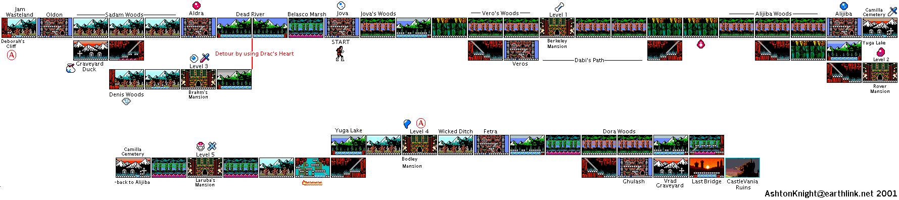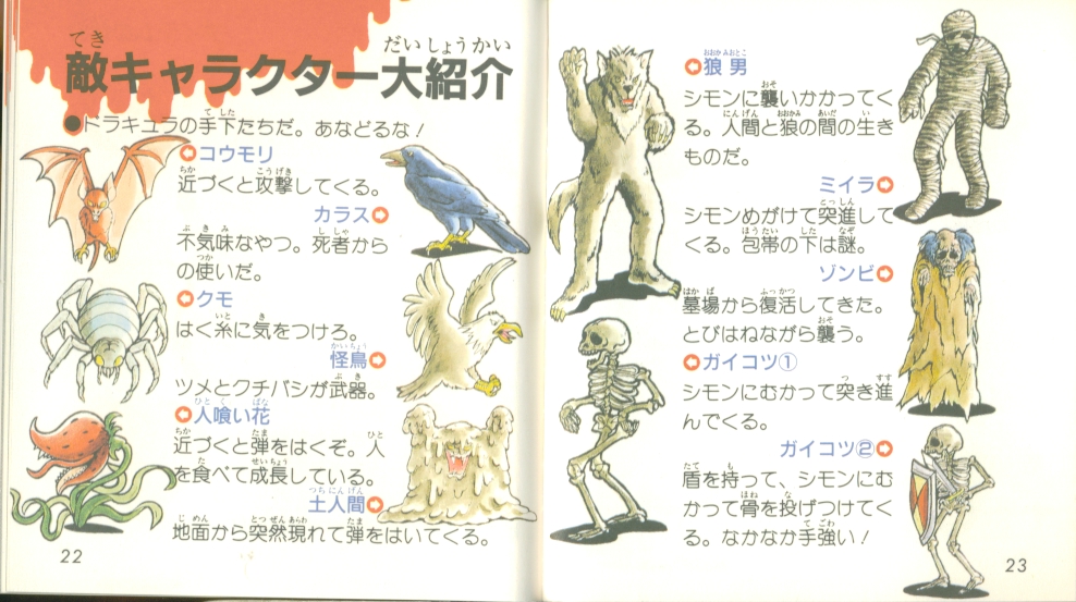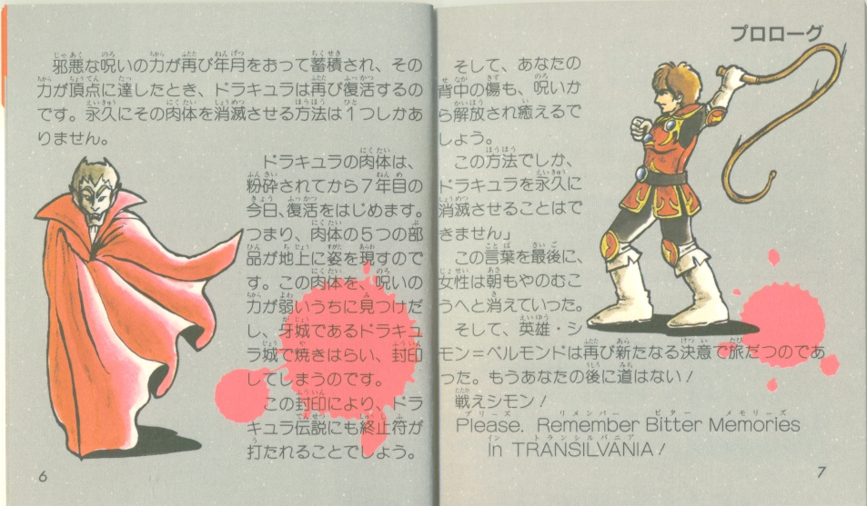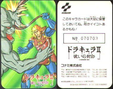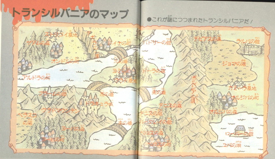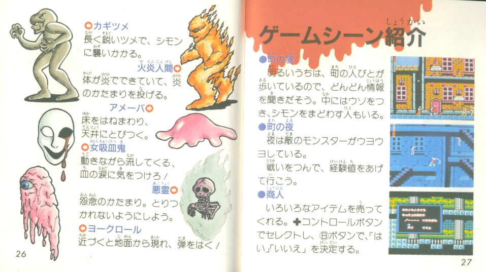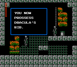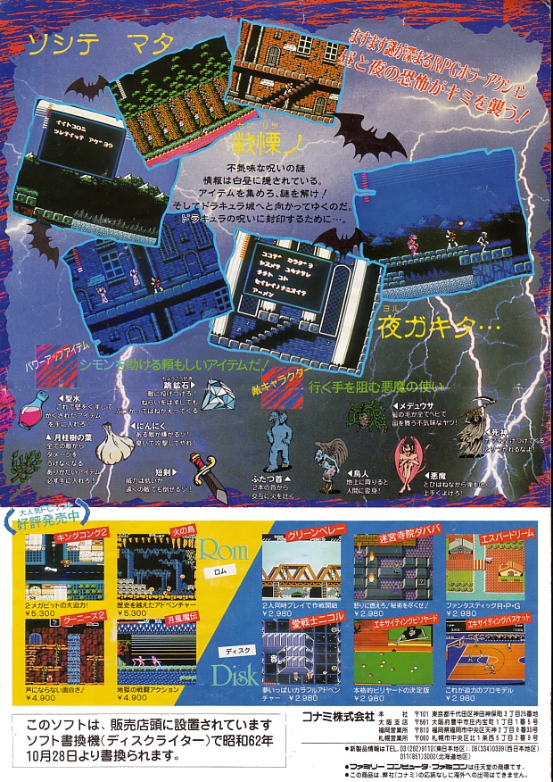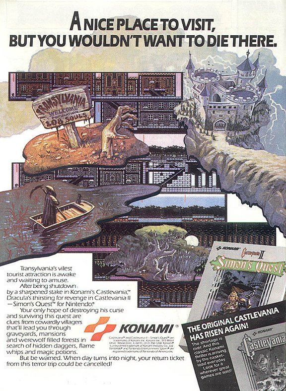 to Metroid and Konami's own Goonies 2), and ended up with the classic we now know today.The storyline actually picks up shortly after Dracula's death in the original Castlevania, despite the fact that Simon now returns to his Vampire Killer-style color (red and black) as opposed to his Castlevania 1 dark brown pallete. It turns out that Simon Belmont's murder of the Count wasn't exactly a good thing, and a pestilence has been set upon the land. Naturally, the townspeople everyone are none too happy, and this being an RPG, are too busy walking back and forth to really do much of anything. What's further, Simon is actually facing the brunt of this curse - if he does not break it, he will surely die. The only way to break the Count's seal is by collecting his five body parts, mysteriously strewn throughout the land, taking them into the depths of Castlevania, and burning them. As Simon, you must explore Castlevania, traversing through towns, caves, swamps and forests to find the mansions that house these body parts, and discover items that will help you. While the game controls and feels similar to the original Castlevania, one of the biggest difference is the difficulty - or, lack thereof. You'll fight tons of monsters, but it doesn't really matter - die, and you'll simply be resurrected in the same spot. Run out of lives, and you're docked all of your hearts, but otherwise continue nearly unscathed. The mansions provide some challenge, mostly in avoiding the many traps and facing the few bosses (most of which you can simply walk past), but the only real hurdle you'll face during this quest is your own confusion.Naturally, given that translation of this game was given to a bunch of drunken semi-English speaking monkeys (as were most NES games), you are pretty much left in the dark to what you are actually supposed to do most of the time, so mostly you just sorta walk around until you stumble upon something useful. In spite of this, the game is still less confusing than the aforementioned Metroid or Goonies 2, mostly due to the fact that the world of Translyvania isn't all that large. Given the memory constraints though, almost all of the areas tend to look the same, making exploration a bit more baffling. It's nothing that a FAQ won't cure, however. The addition of a timescale, creating gameplay during both the day and night time was very innovative for the time, too - enemies are stronger during the dark hours, but yield more experience and hearts. Even though it's flawed by today's view, the game still broke quite a bit of ground by taking the Castlevania feel and revamping it to suit other genres. This flexability is one of the aspects that makes the series so interesting, and has led to Symphony of the Night and Circle of the Moon - arguably the finest moments Castlevania has ever seen. Toss in the best soundtrack you'll ever hear in a NES game (both in sound quality and composition), and you've got another seminal title that we all know and love. Thanks to Rob Strangman for the manual scans.