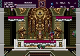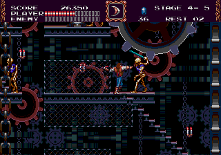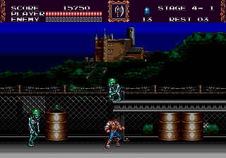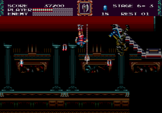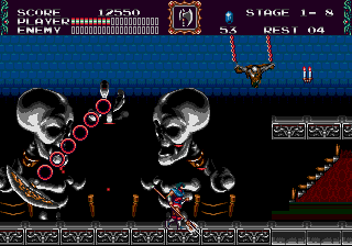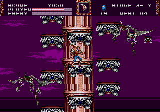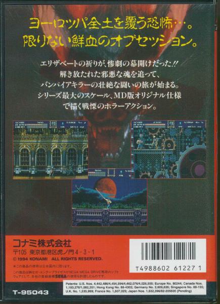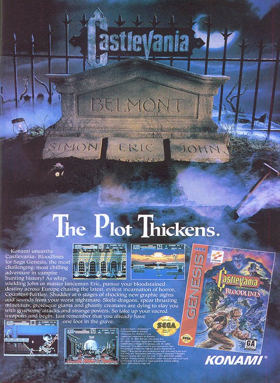 Tiny Toons, there was Castlevania Bloodlines.In an attempt to merge together the Castlevania storyline and Bram Stoker's Dracula novel, Bloodlines casts you as John Morris, son of Quincey, the one who sacrificed his life to kill the evil vampire. He is aided by his friend Eric Lecarde, who seeks revenge against the demons of the underworld. Taking place in 1917, the evil Countess Bartley is attempting to resurrect her uncle Dracula. Obviously in need of being defeated, the heroes set across Europe, traversing various landmarks (from the original Castlevania level to the Leaning Tower of Pisa to the fountain at the Palace of Versailles) to find and destroy her before the Count comes back. While there are only six levels, they are fairly long. While John is the standard whip-toting Castlevania protagonist, Eric wields a spear. Each of them controls a little bit differently (John can swing from the ceilings from his whip, Eric can use his spear to pole vault) and their paths diverge slightly in one or two levels, but for the most part, they're pretty similar. You can equip one of three special weapons (axe, boomerang and holy water) per usual Castlevania protocol, as well as a special attack unique to each character that you obtain when powered up enough. Being that the Genesis is a bit less powerful than the SNES, the graphics have taken a bit of a step backwards. The characters have shrunken to the size of their NES counterparts, and even the awkward control scheme returns. In spite of these set backs, Bloodlines still manages to look amazing for a Genesis title, which incredibly well detailed backgrounds and lots of special effects from the programming wizards at Konami (reflections on the water, a shaking tower, a section done entirely upside down.) The music quality isn't quite up to par with the SNES version either, being that the Genesis' FM chip just doesn't quite stack up. Still, the music is superb. The soundtrack was done by Michiru Yamane, composter of Symphony of the Night, and there's a good number of very memorable tunes, especially the first level. Unfortunately, while the music is excellent, the sound effects are a bit on the lame side. Bloodlines is one of the only Castlevania games to actually have a difficulty level select. The type of ending you get depends on how hard you set the game to be, as typical of 16-bit Konami games. There are limited continues, but the password system is still present. Of particular note is that, for the first time (at least in America), Castlevania is bloody. Crows peck at a bloodied corpse, torn bodies hang in the background, harpies get decapitated and spurt plasma before eventually falling to their deaths. It's subtle, but there's more gore here than any of the Nintendo Castlevanias were allowed to have. Despite the setback in appearance, Bloodlines still plays like any good Castlevania game - spectacular level design, fabulous music, and two playable characters make one of the best action games on the Genesis. Japanese scans by D&P Haber.