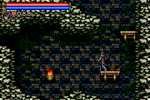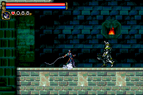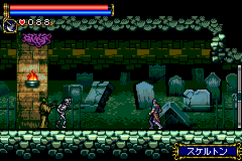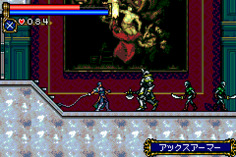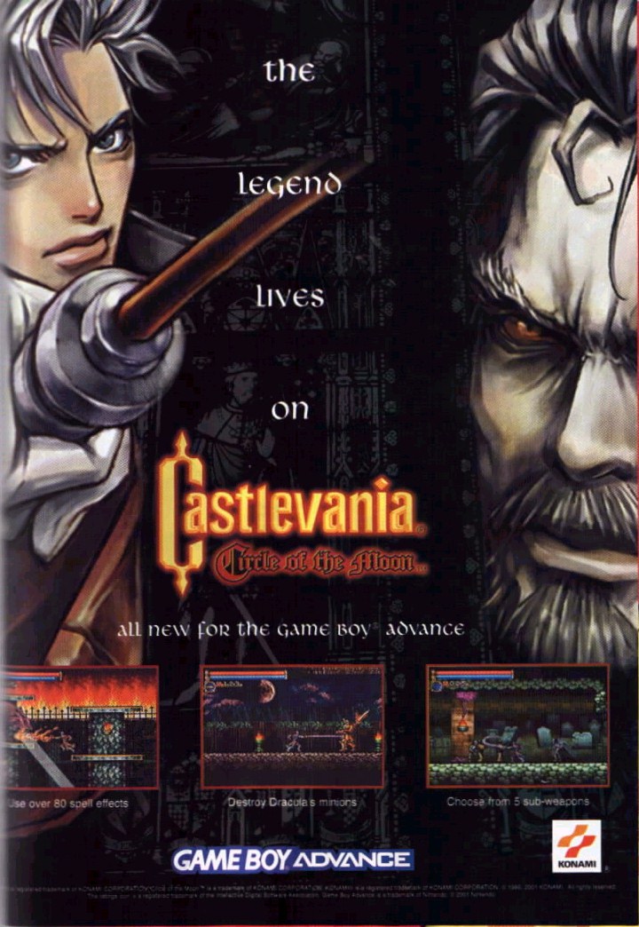 Check out the Unofficial Castlevania: Circle of the Moon site!Ever since Symphony of the Night, Castlevania fans have clamored relentless for a sequel. Was the series destined to move to 3D and stay there? Nintendo and Konami puts these fears to rest with the announcements of one of the first Game Boy Advance titles: Castlevania: Circle of the Moon. While not exactly a true sequel to Symphony, many of the elements contained in the games are the same, and the game even stays true to its Castlevania roots by putting you in the role of a whip-wielding hero. The game begins with Dracula's resurrection by Carmilla, before Nathan Graves, his Hugh Baldwin and their master, Morris Baldwin, steps in. The count causes the floor beneath Nathan and Hugh to crumble, causing them to be seperated from Morris. Hugh sets off on his own to save his father, telling Nathan to leave the castle. Not willing to just give up, Nathan begins the exploration of the caves beneath Castlevania. Many elements are directly from Symphony - the map looks identical (click here to see it), enemy names and numerical damage indicators pop up when you attack, and there are a variety of items scattered around, like stat-improving relics that increase HP or heart maximum, and other relics that give Nathan special abilities (like the Dash Boots obtained early in the game, which thankfully allows quick exploration.) Experience is gained from killing enemies as before, and there are various items to equip on your body and arms. Nathan has a slide attack and can swing his whip in a circular motion, like Richter could in SOTN. One of the biggest differences in level structure is that Castlevania is a lot more wide-open and focused less on small passages. As a result, there's a lot more platform jumping to be found here - especially in stages like the Machine Tower. However, since this is a cartridge game, and while the graphics are excellent (even on the small screen), the castle areas lack the variety found in Symphony, so many of the areas end up feeling and looking the same. There aren't many items to find in the game, but their purpose has been replaced by the DSS card system. Various enemies will drop a total of 20 different cards, whose attributes can be combined for a varying number of effects. One allows you to alter your whip attributes - make it engulf the enemy in flame, turn them to stone, or simply lengthen its reach. There are tons of other stat-altering effects, like awarding experience as you walk, extending invulernability time after damage, increased defense as you uncover more the castle - there's simply a lot of depth hidden in these cards, and is far more managable than the legion of near-useless items in Symphony. One of the most obvious differences from the beginning is the difficulty level. As good as Symphony was, it wasn't very hard - considering the nature of previous games, it was just a tad disappointing to play a Castlevania game that was essentially a walk in the park. While the difficulty is not overwhelming, you'll have to summon your old twitch reflexes if you want to beat some of the bosses in the game. Circle of the Moon uses a surprisingly large amount of old music from other Castlevania games: the save select screen is exactly the same as Rondo of Blood (a very impressive feat for the sound programmers), the intro and boss themes are from Castlevania 64, and various other music spread across the series has found their way here. There are a handful of original themes, and most of them are excellent. However, as with the repetetive graphics, the music suffers too - there simply isn't very much music, and even the better songs tend to get old when its played constantly. Castlevania: Circle of the Moon is, quite simply, the reason I bought my Game Boy Advance. It combines the non-linear action-RPG elements of Symphony with somewhat more traditional Castlevania gameplay, and ends up with an addicting, immensely fun title.