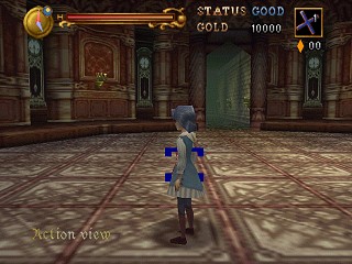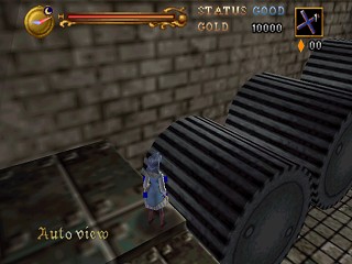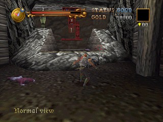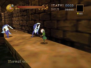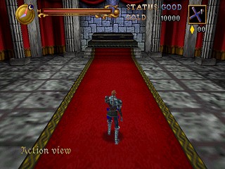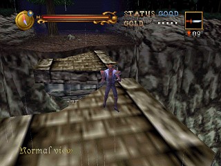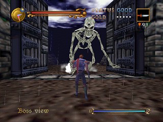 levels. There are two primary types of levels found here: linear stages that simply require you to get from point A to point B, usually with lots of Tomb Raider-style jumping. The other type are more adventure-like, where you're given a fairly large area and must find certain items and solve minor puzzles before you're allowed to proceed. Given the nature of the game, most of your deaths will be due to missed jumps. Oddly enough, you only have one life, though there are a plentiful amount of save crystals that let you resume when you die. While you have a fairly large life meter, you'll often find it quickly depleted fight bosses. Thankfully, there is a merchant to be found - the devil Renon is around to sell you meat and other accomodations. Don't spend too much money though, or else you'll be punished at the end at the game. Much like Castlevania 2, there's also a time aspect to keep in mind - night and day run on a constant cycle. Unfortunately, this barely affects the game at all - a real missed opportunity. Also, if you take too long, and you'll get the bad ending. Konami also tried to tie the storyline a bit closer into the game, with a couple of supporting characters, including Actrise the witch, Charlie Vincent, a Van Helsing-esque vampire hunter, and tortured vampire temptress Rosa. Perhaps the most annoying aspect of Castlevania 64 are the controls. Imagine the original NES Castlevania. Now imagine it in 3D. Both characters act as if they are moving through mud, even when they're running. Whipping enemies is a chore, given the long recovery time after every attack. This is made doubly more irritating by the slowdown when facing multiple enemies - and the fact that you get knocked to the ground after powerful hits. To its credit, there is a lock-on system that lets you easily attack enemies, but it's not as nice as Zelda's Z-targeting system. The camera is hardly the most wieldy out there, though it does often change itself depending on the situation at hand - it will stay fixed during platform jumping or at a certain viewpoint when fighting a boss, rather than the default behind-the-shoulder view. Graphically, the characters are all fairly well detailed, but the environments are a mixed bag. Most the castle interior levels are pretty cool looking, though the caverns and outside stages are often fairly dull. There's also a good amount of fog, which greatly diminishes much of the visual impact. The music also isn't very Castlevania-like - it's more ambiant in nature, and you'll barely hear any classic songs in the background. While it sounds like Castlevania 64 will provide more irritation than fun, there are some genuinely classic moments. The hedge maze, where you'll be chased by a chainsaw wielding maniac, is one of the most intense moments found in the series. Equally as amusing (or sadistic, depending on your point of view) is a section where you must carry a bomb from one part of the castle to the other. If you jump or are attacked by enemy, it blows up, and you die instantly. Naturally, the level designers threw in lots of narrow platforms that require steady balance if you want to live. And once you get past the dull opening stages of the game, the later levels, particularly the Tower of Execution and Tower of Sorcery, are actually fairly fun (though the Duel Tower will cause you much, much frustration.) If Konami had fixed the controls and allowed for faster, more dynamic gaming, Castlevania 64 would definitely be a defining point in the series. As it is, it's a footnote in Castlevania's lineage, the first attempt to try to evolve the series before heading to the Game Boy Advance to reproduce its success with Symphony of the Night. On a final note, Legacy of Darkness almost makes this original release obsolete. Reinhardt and Carrie are both playable in the N64 sequel (though not inititally) and while the level structures are different, they're practically the same game. If you're a completist (or don't have the patience to play through Cornell's game) it's worth picking this up - otherwise, you can skip this one and just buy Legacy. Thanks to Mario Ciampa for the screenshots.