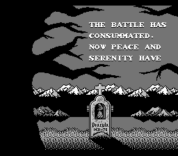The battle has consummated. Now peace and serenity have been restored to Transylvania and the people are free of Dracula's curse forever. And you, Simon Belmont, will always be remembered for your bravery and courage.