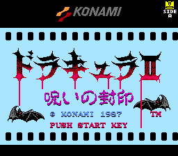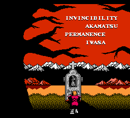 Check out samples from Dracula Best 1 to hear the Japanese version. You can also download the NES versions MP3s to compare. "What a horrible night to have a curse" has become a famous line. The Japanese version is "Soshite senritsu no yoru ga otozureta", which translates to "And so the shiver of the night has arrived". The other line, "The morning sun has vanquished the horrible night", is "Akumu no you na, yoru ga aketa". This translates roughly to "Like a nightmare, the night has ended." (though the word "aketa" has the additional connotation of "dawning", like a sun.) Oddly enough, the endings are also different - they have the same graphics, but the text - written entirely in English - is very different. It's also extremely goofy - go Engrish! (Mispellings, including "Simmon Belmont", preserved for additional hilarity.) Additionally, the game tells you how long it took you to finish, and even lists some very cryptic end credits. Thanks to Morgoth Galaxius for the picture.