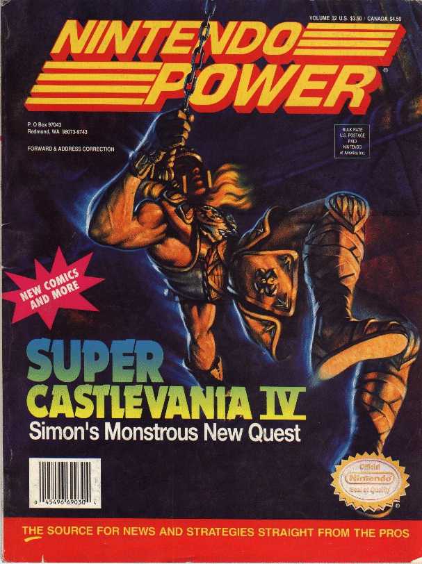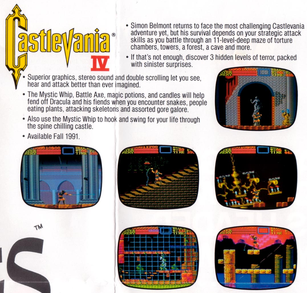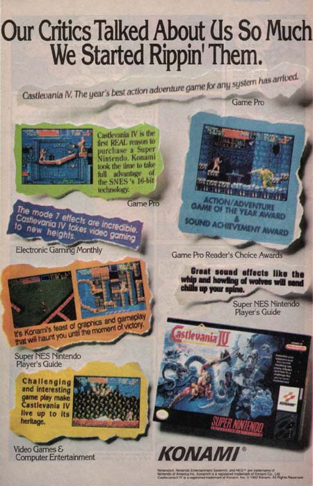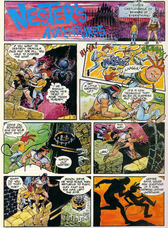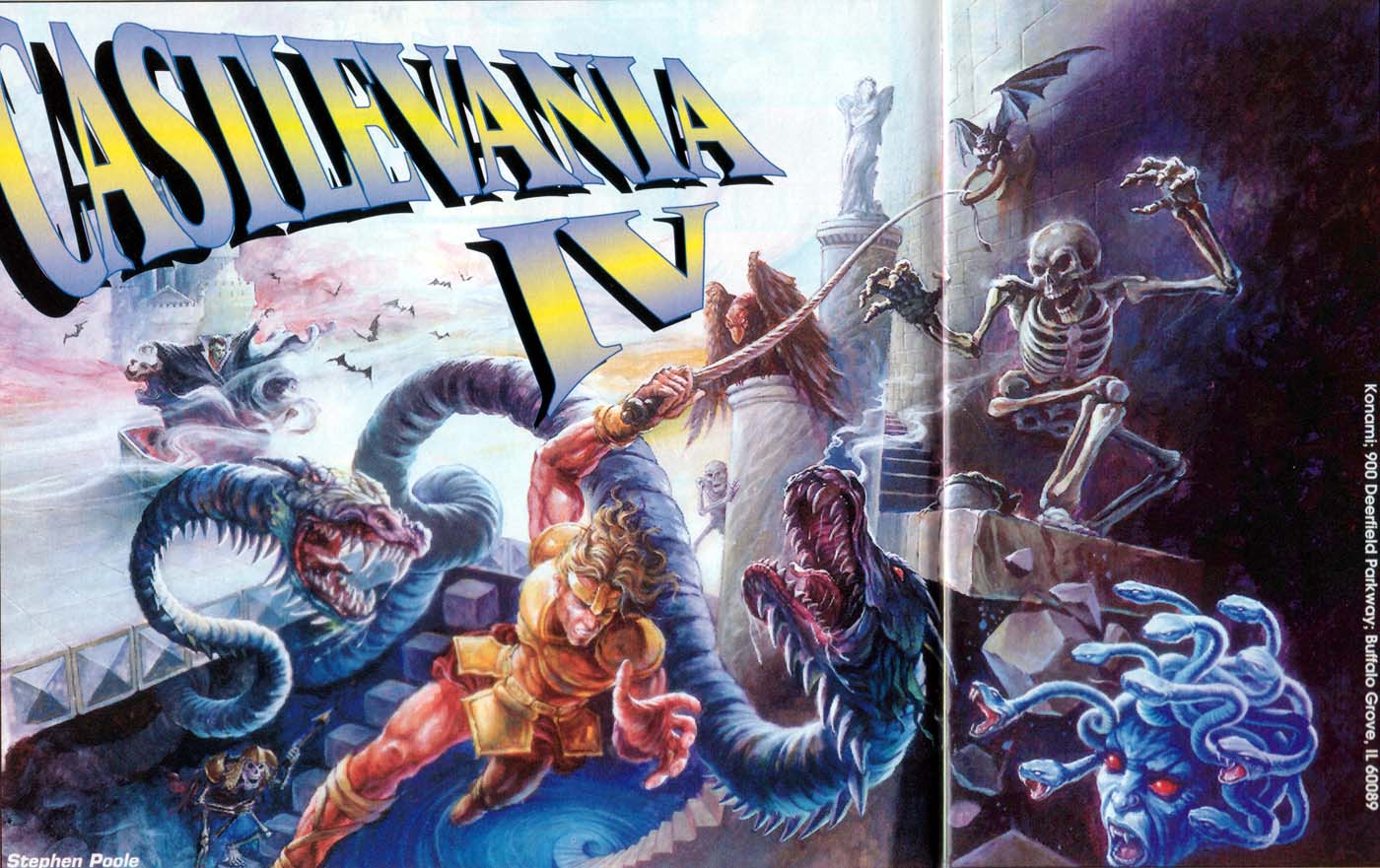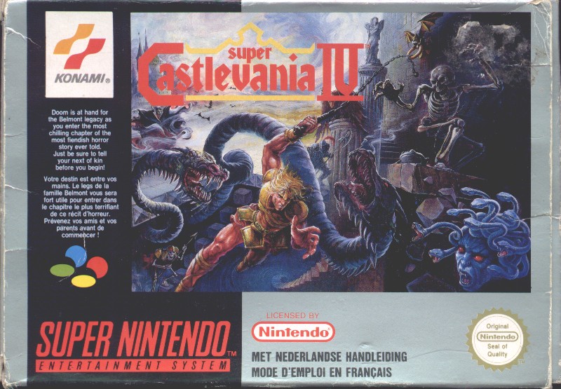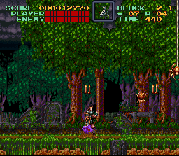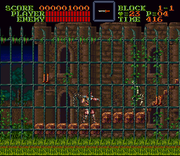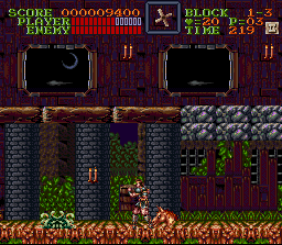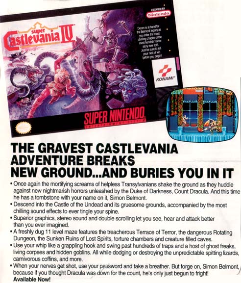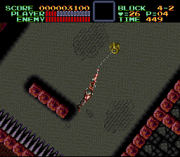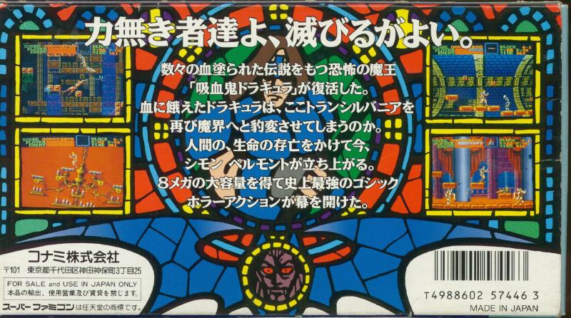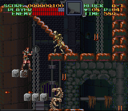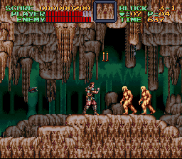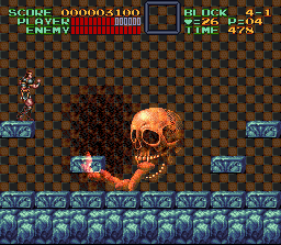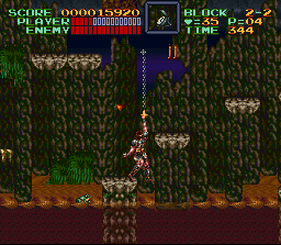 One of the first titles to receive such treatment was Super Castlevania IV.More of a remake than a new game with a new plot, you once again take on the role of Simon Belmont to destroy the count. Instead of starting on the front door of the castle, you good a good several levels making your way through stables, caves, smaller mansions and forests before you finally reach the inner levels of Castlevania, which includes a haunted library, dungeon and treasury. The first thing you'll notice is how much bigger everything is. Simon has grown quite a bit thanks to the graphical enhancements, and looks quite a bit different too. Similarly, the backgrounds are very well detailed, and suitably dark. There are also several instances where the game shows off the SNES' Mode 7 capabilities, with a room that rotates and a rock monster that grows steadily as you attack it. The music too, is very dark, but utilizes the SNES synth to its best and creates sound filled with organs, drums and pianos. Despite the obvious advancement in graphics and sound, Super Castlevania IV actually took a step backward in gameplay. There were no multiple paths or characters like in Castlevania 3 - you were confined to one character, on one path, though you were given a password option. However, the controls were fixed quite a bit. While Simon is still a little stiff, he can whip in any of the eight directions - one of the only Castlevania games in which you can do so. You can also use the whip to latch onto certain hooks and swing across them, Indiana Jones-style. By holding down the button, you can even twirl your whip around, though this is very weak and is only really useful for blocking projectiles. Super Castlevania IV is also a bit easier than its NES predecessors, though it's certainly no walk in the park. Some may consider this a relief. While it's one of the earlier SNES game, Super Castlevania IV still stands as one of the best, and oddly enough, beats out the Dracula X game for the system in most every aspect.