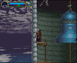 Accessible from the end of the hallway of the Marble Gallery, the Outer Wall extends vertically on the east side of the castle. Fog occasionally swarms in making things hard to see. If you can find the switch, an elevator can be activated to make traveling a lot easier. At the bottom of the wall lies a strange chamber with a telescope that allows Alucard to view the ferryman. Climb up the Outer Wall and you'll find the door to the Long Library and, farther up, the Clock Tower.