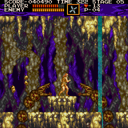 The caverns are heavily reminscent of a similar level in Super Castlevania 4, forcing you to fight against water streams, falling stalactites and weird green slime stuff. This level is particularly noteworthy for the merchant near the end of the level - you can keep whipping him to change the items that he'll drop for you (this is also the most convenient place to get the herb, one of the most useful items in the game.) At the end, you'll end up on a raft that speeds upward as the well is flooded before meeting a bone dragon at the end.