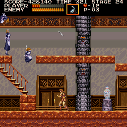 There's also a tower to be scaled in which you'll face a knight made of shattered stained glass (again, right out of Haunted Castle, and reused in Castlevania 64.) The end boss, Medusa, is the same as the original, although this time you face more than just her head.