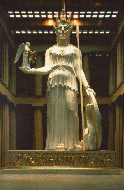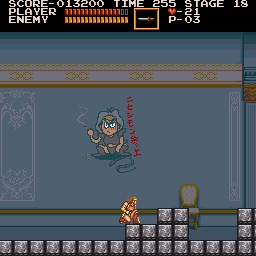 In the background of level 3, there is a vampire frozen in a block of ice. This vampire looks much like the titular character in the old German movie Nosferatu.Much like the original Castlevania, there's a hidden Moai (the Easter Island head from Gradius) treasure. According to Ho-Ghan Liu's FAQ, it's at the beginning of level 4. Go up to the top of the tower, and just before exiting, walk right and fall and you'll find a Moai for 4000. According to Doug Riggle, the large statue crying tears in level five is actually the Greek goddess Athena. The same statue can be found in the Parthenon in Greece. Doug sent this picture, a replica of this statue found in Nashville, Tennesee.