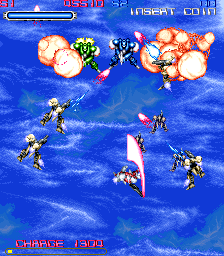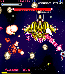 The game’s difficulty level is a bit strange due to the way continues are handled – like R-Type, the game uses a checkpoint system when only one player is active, but if two players are playing, either can continue at any time as long as the other is alive. This makes the game much, much easier for two players to complete – especially considering that many of the early bosses seem to be designed assuming only one player is in the game. This makes a bit of a dichotomy between playing with one and two players; it becomes a game which is frustratingly hard for a single player, but fairly easy for two players. Given the rate at which two players can burn through the lifebars of even the toughest enemies, I doubt that it would take more than a fistful of quarters for a pair of moderately skilled players to blaze their way through the game.