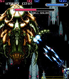 The game is not without its faults; its presentation is fairly mediocre, it’s short, and its difficulty is uneven. Most of the stages take place in outer space, and while some effort has clearly been made to differentiate the stages, it’s not really enough – at a brief glance, there’s not a whole lot to set the first stage’s asteroid city apart from the third’s minefield or the fifth’s enemy fleet. On the other hand, there are a couple standout stages and scenes- the second stage takes a hint from R-Type and consists of a running battle against a giant tank on the lunar surface; it’s sets the stage apart from the rest of the game. The final battle is a dogfight against a single enemy robot during reentry into Earth’s atmosphere – it’s a cool, memorable stage. For most of the game, you’ll also be fighting the same half-dozen varieties of generic enemy mecha; while the game ends before this becomes too repetitive, some more variation would have been nice. While the game’s mecha designs aren’t bad, they’re not particularly standout, either, and one boss in particular – the inexplicably biological Hell Golem Alpha – doesn’t seem to fit with the rest of the game’s mechanical designs. On the whole, apart from a handful of very nice ‘cutscene’ graphics, the sound and graphics are unremarkable – quite frankly, they don’t stack up particularly well against some of the year’s Super Nintendo games, let alone competing arcade titles like Batsugun or In the Hunt.