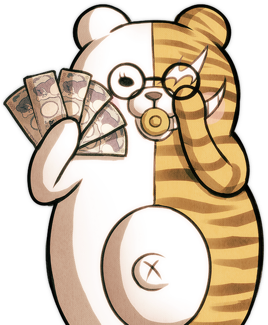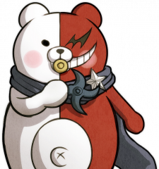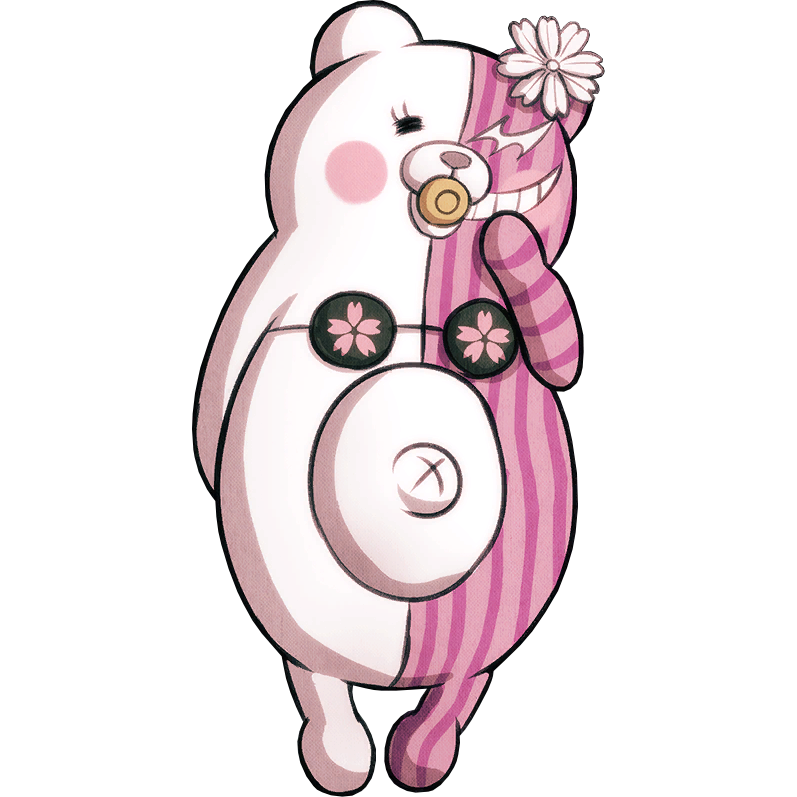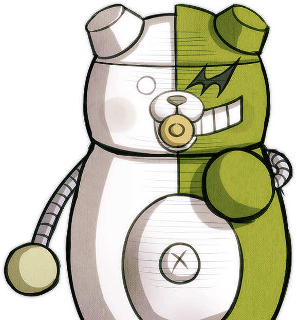 Monokuma’s five children, although they are plush robots just like him. He alternates between affection and annoyance at their antics. They pilot the Exisal mechas that patrol the school, and deliver the morning/nighttime announcements. It’s clear that they were given too much responsibility because their screw-ups throughout the game’s plot are noticeable.