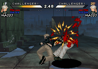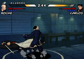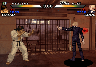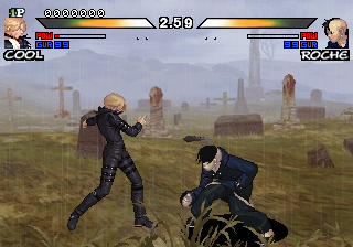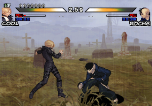 Akin to most of Psikyo’s later releases, Daraku Tenshi has fantastic graphics despite being suitably darker and grittier than their bright and whimsical shoot-em-ups. The backgrounds seem to use 3D renders to create realistic areas that have deliberately drab colors and feel like areas you’d find at a cityscape. These include bars, a rooftop, jail, a graveyard, and an airport hanger which boasts the most impressive setting with flaming wreckage in the background, complete with fire that almost looks photorealistic. The characters themselves are animated fantastically with large sprites, closer in comparison to Art of Fighting than the more compact sprites of Street Fighter and Fatal Fury. For a small and obscure game, there’s a surprisingly fine range of voice talent for the characters, including Hikaru Midorikawa (Marth from Fire Emblem) as Cool and the late Daisuke Gori (Heihachi from Tekken) as Harry. The music, while not really outstanding, isn’t all that bad either. The instrumentation is a bit weedy, but the composition gets points for having a more gloomy and atmospheric mood to fit the complimentary dreary graphics.