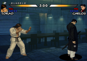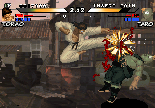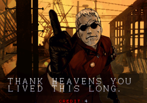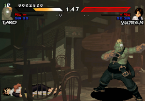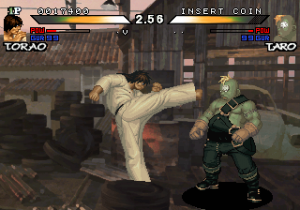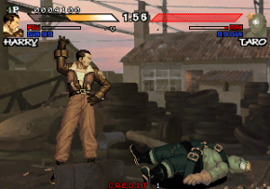 In addition to the unbalanced gameplay, something about the overall design feels a bit off. Character portraits just seem like scaled-down official artwork for the game, instead of being digitally coded in as sprites. Win quotes tell very little of each character’s personality (though to credit, all quotes are unique depending on which character you fight). It doesn’t come up as much in versus play, but the single-player experience seems to be lacking some spark. While not too big a deal, lots of fighters, particularly from SNK, kept one-player runs charged with a degree of familiarity among each character in dialogue, as well as cutscenes to supplement whatever ridiculous storyline was given to the game. In contrast, no characters in DT have any endings. All you get for text are their quotes and the static cutscenes before fighting the bosses. Endings in fighters tend to be interesting and/or ridiculous rewards for quashing the overpowered boss character, but DT giving no such concession is rather unfortunate. No official bios of any characters exist in supplemental material, which is a shame due to the interesting designs and the overall post-apocalyptic atmosphere of the scenario. You can glean faint glimpses of familiarity with a few win quotes (Yuiran and Taro are apparently good friends, Carlos refers to Haiji as “his mistake,” etc.), but that’s as deep as the plot runs. It’s not like fighter plots have to be Kojima-esque mind twists or anything, but it’s always nice to at least have a bit of interaction between contestants. DT comes up short in the polish department, perhaps a reason why it’s not spoken of today.